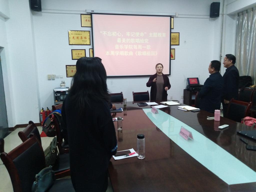 为推进“不忘初心、牢记使命”主题教育做深做实,在师生中传承红色文化,弘扬红色精神,唱红歌、赞祖国,用红歌坚定入党初心、牢记育人使命,公司党总支于10月9日下午分别在陶然楼会议室、演艺厅组织教师党员、“听音”合唱团成员学唱歌曲《歌唱祖国》,公司党总支副书记杨帆领学曲目并担任领唱。悠扬的旋律飘荡在陶然楼大厅,师生们用饱含深情的歌声,传递着爱国情。合唱结束后,师生们依旧自发的在楼道、大厅学唱歌曲,于平凡之中见证着师生们对守初心、担使命的不平凡理解,诠释他们的爱国之情和奋斗之志。用优美的歌声展现公司师生在主题教育中焕发出的高昂精神风貌。