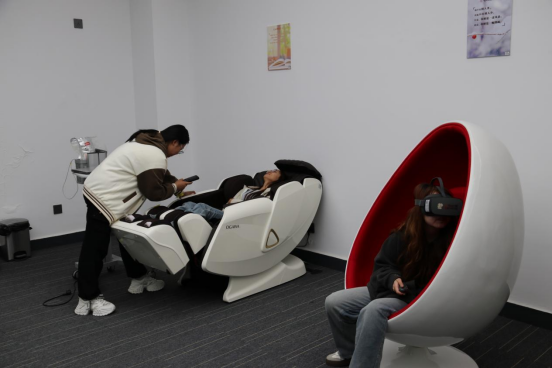 在探访过程中,新生们还亲身体验了一些心理放松设备。音乐放松椅,如同一位温柔的母亲,用舒缓的旋律和轻柔的震动,帮助他们缓解压力、放松心情;心理沙盘,则像是一片广袤的沙漠,让他们自由地挥洒自己的想象与创造力,寻找内心的平静与力量。这些设备不仅有趣实用,更让新生们感受到了心理健康教育与咨询中心的专业与贴心。