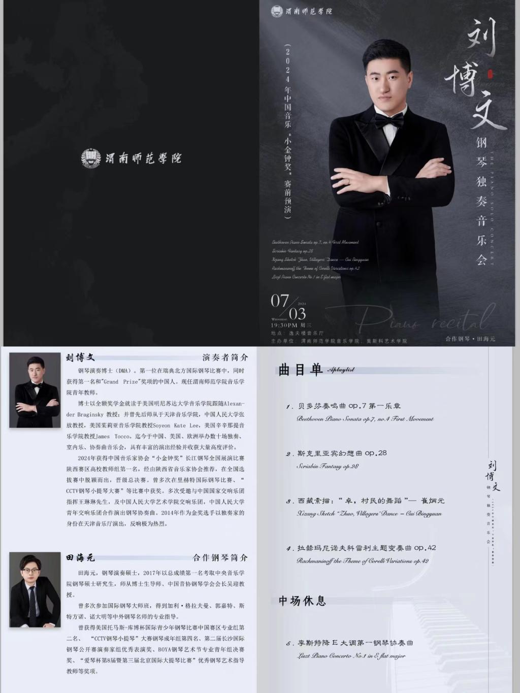 “刘博文钢琴独奏音乐会”将于2024年07月03日(星期三)19:30在逸夫楼音乐厅进行,诚邀您光临指导!