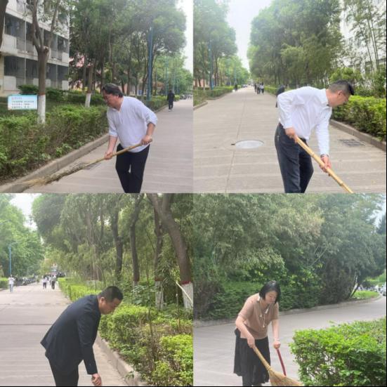 活动伊始,公司领导亲自挂帅,率领师生们迅速投入到紧张而有序的打扫工作中。公司联系单位——审计处、校医院的领导和老师们也按时到达指定地点,一同投入到卫生打扫的行列中!大家分工明确,密切配合,对校园内的各个角落进行了全面清扫。无论是教学楼、琴房,还是操场、绿地,都留下了师生们辛勤劳动的身影。