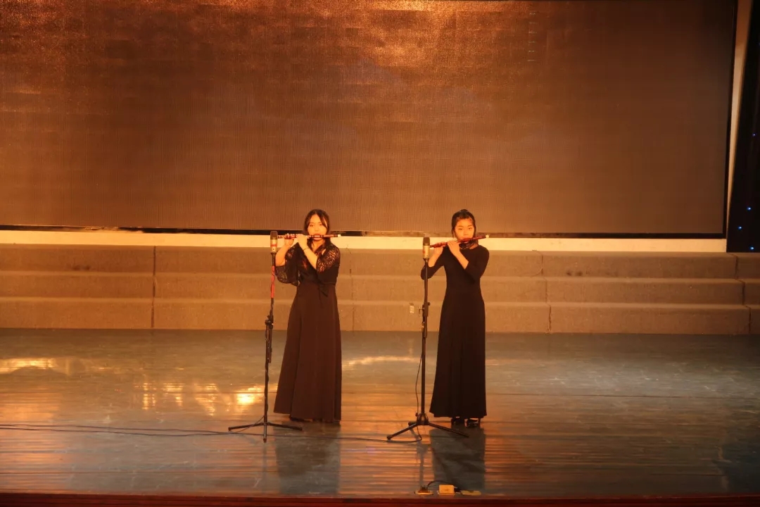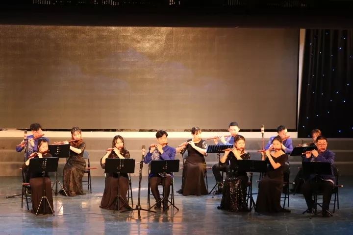 《望乡》 一曲以沁人心扉的笛声为主音,给听众留下更加丰满的情感渲染。常听词曲,可解乡愁。《红高粱叙事曲》由四人演奏,分为两个声部。九儿的一生如书页一般,随乐章的前进在眼前一页页翻过,那诉不尽的爱恨情仇,道不尽的酸甜苦辣全在笛声之中。此曲由石磊副教授于2015年创作,风靡至今。《洗衣歌》作于1964年。在一次藏历新年拉萨人民拥军活动中,民众为部队拆洗衣被,作者从这动人的场面中得到了创作的启示,谱成了这首深受军民喜爱的《洗衣歌》。该曲汲取了昌都民歌、巴塘民歌《江作林令》等藏族民间音乐的音调,曲调起伏跌宕,浓郁清新,充满了欢乐与激情。在此次演出中由竹笛四部和声演绎。《桃园借水》一曲用6个声部演绎得有声有色,加上皮影剧团的两位老先生的精彩演绎。笛子与碗碗腔两种乐器在这一曲中相互交融。由李镇老师作曲的《鄂尔多斯的春天》继承草原原有的艺术特色,色彩绚丽,曲调灵活富于变化且曲式结构工整,常用不规则的节拍,整体结合较为紧密。为我们勾勒出的是一副草原人民载歌载舞的轻快场景。《灞桥》一曲在石磊副教授的演绎下将当时人民的生活环境,生活态度的场面体现出来,历史的滚滚车轮曾从这里一一碾过:秦穆公称霸一方,刘邦、项羽楚汉之争这些历史故事也将永存。《瑶族舞曲》这一曲丰富、生动的展现了瑶族民众欢歌热舞的喜庆场面。乐曲用优美的旋律,表现了能歌善舞的瑶族人民的生活情貌。《渭水秋歌》这一曲在王辉老师的演奏下变得抒情委婉。这一曲以陕西音调为素材创作而成,在独特的舟式演绎下有着不一样的韵味和感悟,感染了在场所有人。