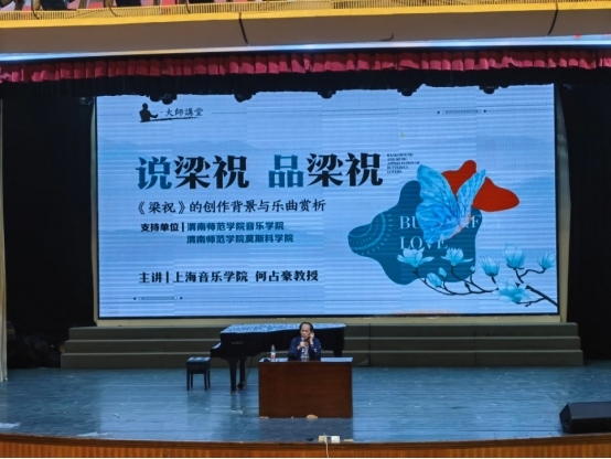 何教授在第二场讲座中,为公司师生讲述了小提琴协奏曲《梁祝》的创作过程。他从《梁祝》的创作背景、曲式分析、音乐素材分析等方面进行了生动的讲解。1959年,他在上海365英国上市官方网站学习期间,与同学陈钢创作这首小提琴协奏曲《梁祝》风靡大江南北,成为中国最著名的小提琴作品之一,被盛赞 “为中国创造民族化交响乐开拓一片绿野”。《梁祝》音乐以浙江的越剧唱腔为素材,吸收中国传统戏曲精华,辅以西方音乐作曲技巧,按照剧情构思布局,综合采用交响乐与中国民间戏曲音乐的表现手法,深入而细腻地描绘了梁祝二人相爱、抗婚、化蝶的情感与意境。其曲调凄美婉转,以情动人,是中国传统音乐与西方器乐完美结合的典范。