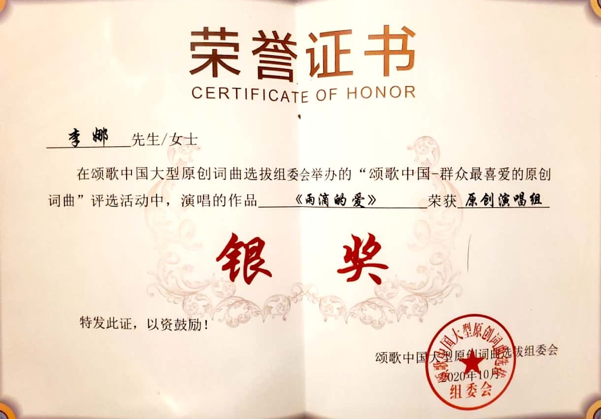 公司教师李娜的原创声乐作品《雨滴的爱》在2020年“颂歌中国”大赛中力拔头筹,荣获银奖。