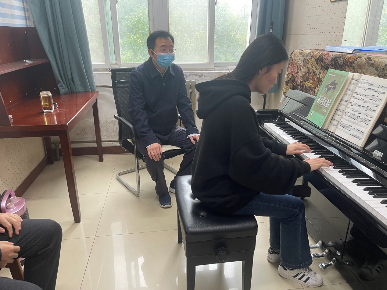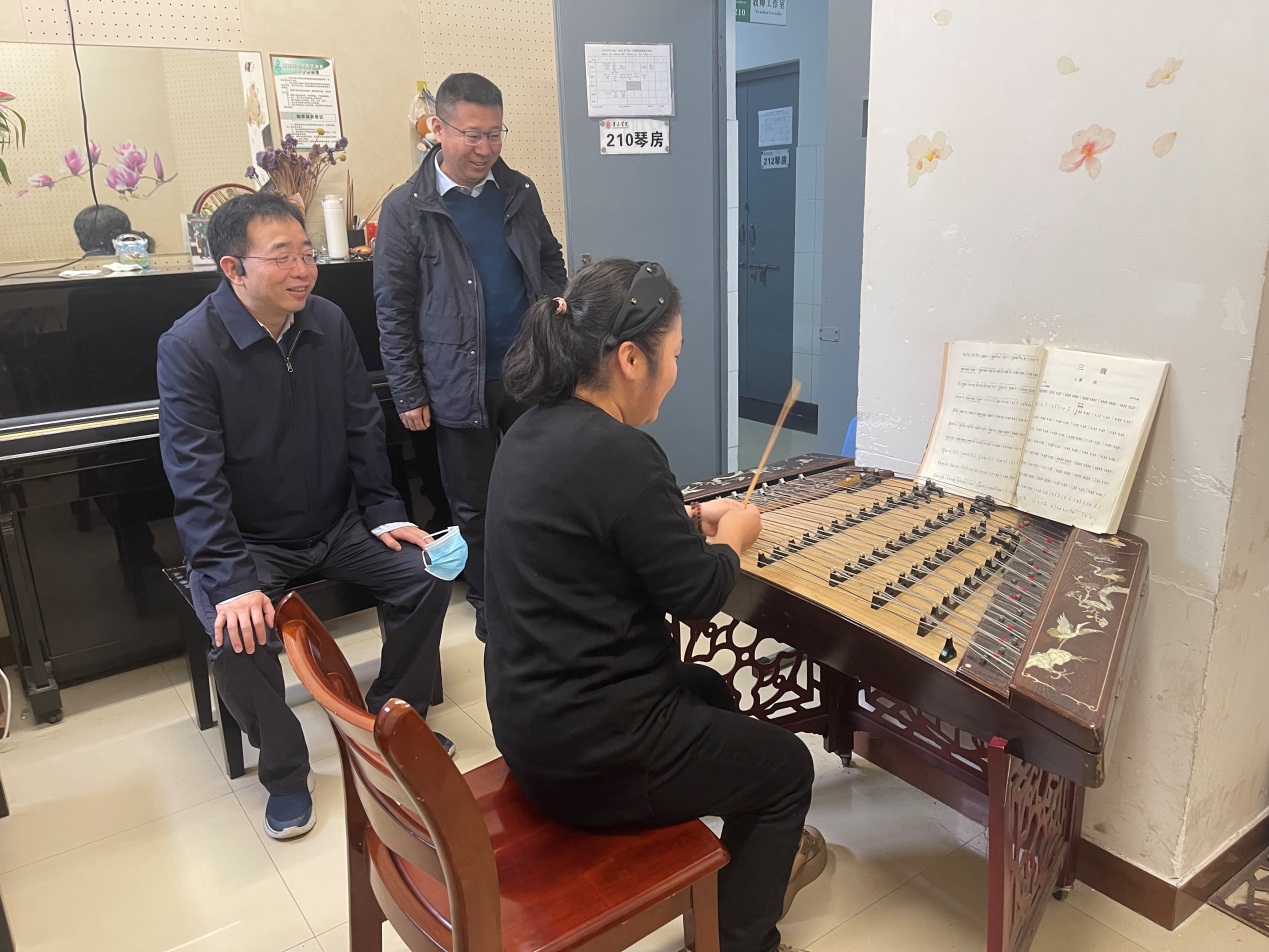 公司领导向张董事长介绍了公司员工实践场所基本情况及日常工作。张董事长充分肯定了公司日常教学工作,并对公司的艺术教学等工作提出了建设性意见。他指出,专业课教学中应结合中国音乐文化,重视中国音乐作品在教学中的比重,重视艺术+思政这一特色,通过民族音乐作品来培养员工的家国情怀和文化自信。