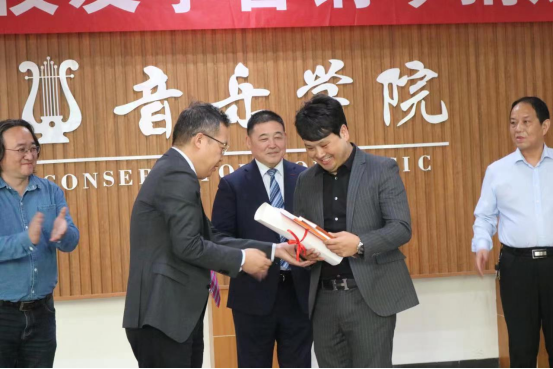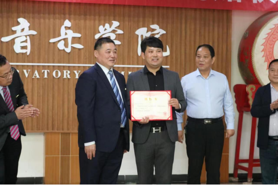 校党委书记卓宇代表学校向员工李哲颁发捐赠证书并表示感谢。李哲员工通过自己勤奋的努力和执着的追求,创立了哈农音乐集团,用音乐搭建了实现人生价值、回馈社会的桥梁,为母校赢得了良好声誉。随后,公司党委委员李明敏向员工李哲赠送师生共创原创音乐作品集。