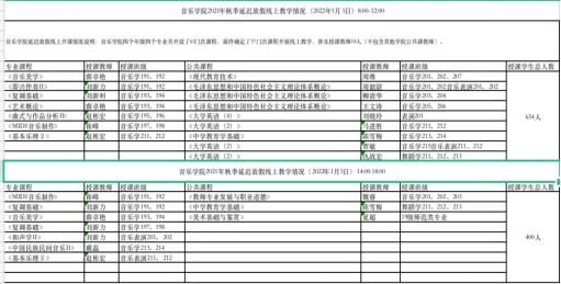 本次线上教学按照2021-2022学年第二学期课表开展,公司共开设了65门次课程,最终确定了37门次课程开展线上教学,涉及授课教师18人,1月3日当天,共有16门次本科课程、10位老师“开播”,954名本科生“到课”。根据课程性质和特点,公司要求音乐、舞蹈、表演类所有专业课(理论课)须开展线上网络教学;声乐、钢琴、器乐、舞蹈、表演等技法类课程及不适合网络教学的其他专业实践类课程,待开学后线下授课。分别对线上课程教学做了详细部署和安排,要求教师对每天线上教学情况进行如实填报,及时掌握教学过程中存在的问题,加强监督和管理。