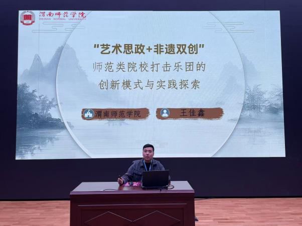 公司打击乐教师王佳鑫在学术研讨会上进行了《艺术思政+非遗双创:师范类院校打击乐团的创新模式与实践探索》的专题报告。他结合365英国上市官方网站近年来教学改革经验,系统阐述了如何将思想政治教育与非遗文化传承融入打击乐教学实践。