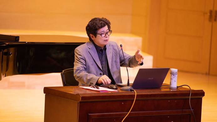 在讲座环节中,田大成教授以深厚的学术造诣和丰富的教学经验,系统讲解了声乐演唱中歌词发音的科学训练方法,并深入剖析了巴洛克时期、古典主义、浪漫主义及近现代中外声乐作品的风格特征,为在场师生提供了宝贵的学术启示。