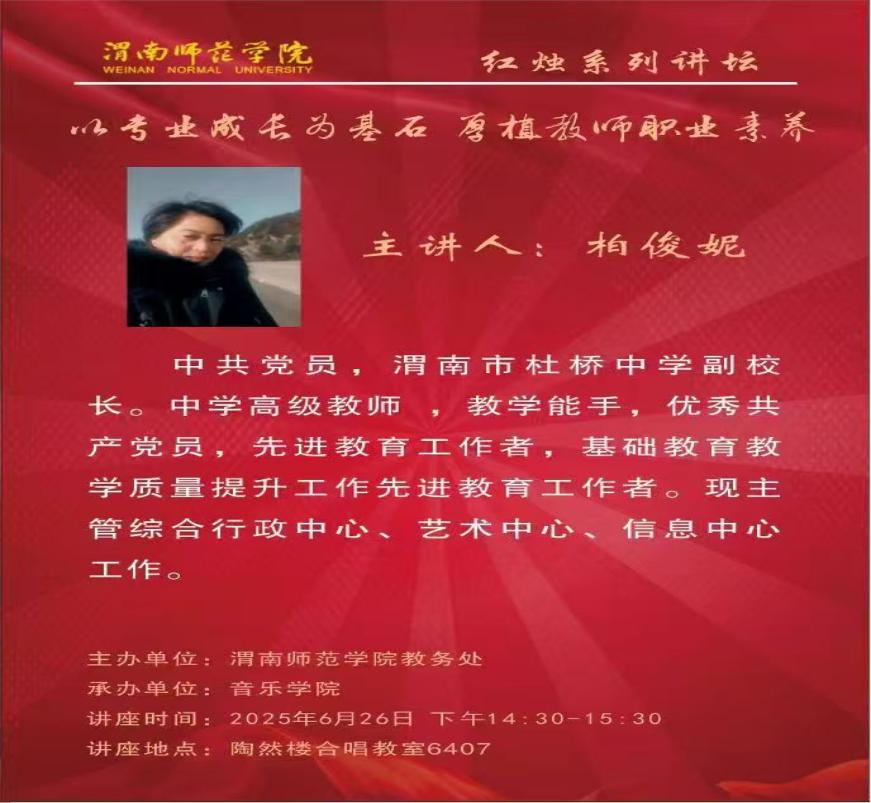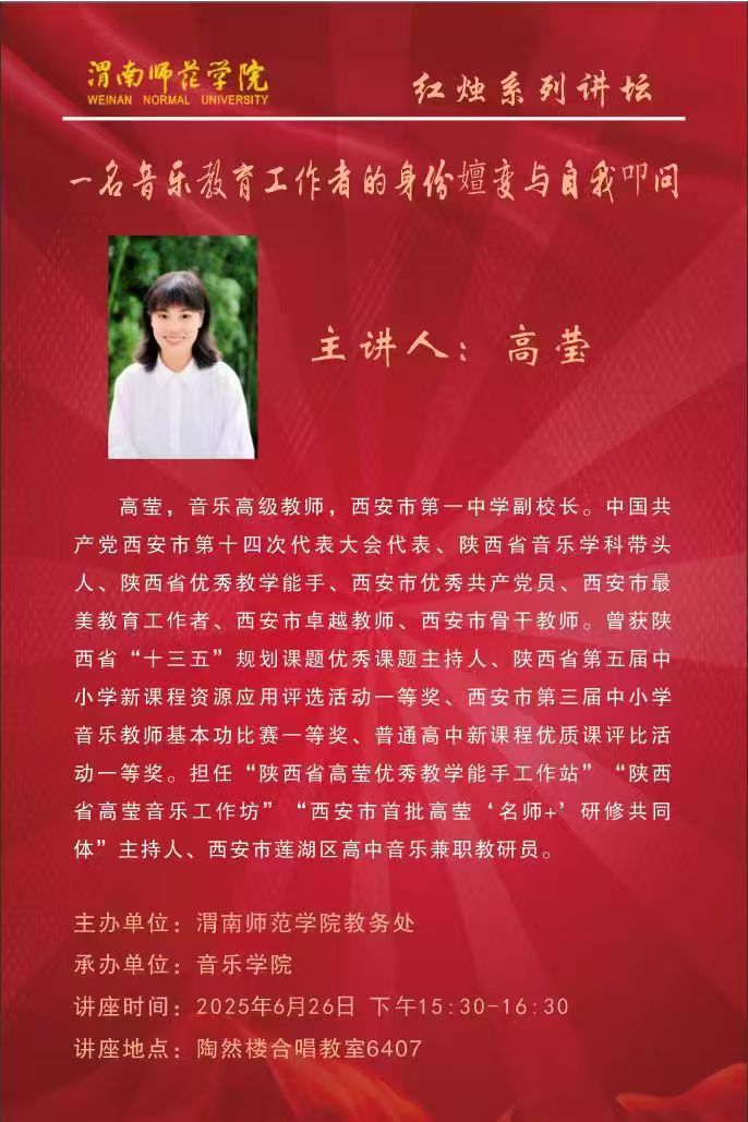 6月26日下午,365英国上市官方网站成功举办“红烛讲坛”系列学术活动,本次讲座特邀渭南市杜桥中学副董事长柏俊妮与西安市第一中学副董事长两位教育专家,分别围绕教师职业素养与音乐教育工作者的职业发展进行专题分享。