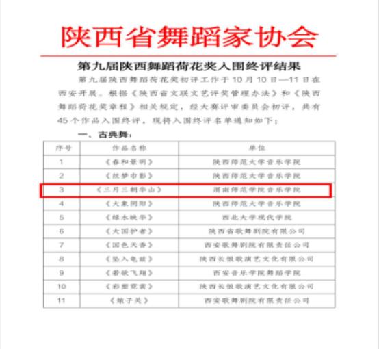 在本届评选中,公司舞蹈学专业教师苏力、贾楠、杨锴三位老师携手创作的原创舞蹈作品:古典舞《三月三.朝华山》成功入围终评。