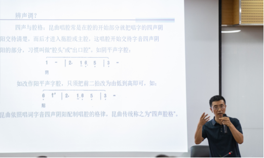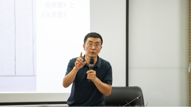 7月11日上午,辛雪峰老师以其丰富的艺术实践经验和深厚的文化底蕴,以“曲牌体与板腔体”为主题,为现场的学员们带来了一场精彩纷呈的学术盛宴。他专业细致地为学员讲授曲牌体与板腔体两种戏曲唱腔结构形式,从中国戏曲发展历程的不同阶段,讲述了两种音乐形成的自身独具特色的叙事方法。通过对经典曲目的范唱、欣赏与分析,从旋律、句数、句式、节奏等元素,深入浅出的让学员理解两种形式特征。他表示,由曲牌体到板腔体,表面上是戏曲音乐结构方式的变化,实际上带动戏曲其他方面的一系列转变,使得板腔体摆脱文本束缚而专注于表演艺术的提高,从而助推中国戏曲史上一次重大变革的完成。