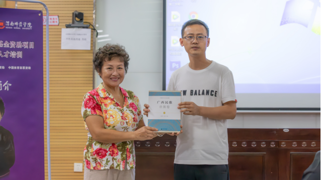 7月11日下午,徐寒梅教授为学员们带来题为“高等教育中的民歌保护与传承探索”的精彩授课。徐老师首先以广西艺术公司民族音乐表演专业为例,介绍该专业的构思成立到发展,培养本科生、民歌传承专业方向硕士研究生,她在实践中摸索出自己的一套教学体系、评价体系,建立了极富特色的“文化修复”课程,在民族特色办学、民歌保护、传承与应用等科研与教学上发表了独到的见解,她指出,要运用多种艺术手法与传统民歌相融合,探索新民歌的多种可能性,徐教授轻松幽默的授课,赢得了学员们的阵阵掌声。最后,徐寒梅教授为项目赠与了书籍《广西民歌》,对学员们的专业发展寄予了厚望。