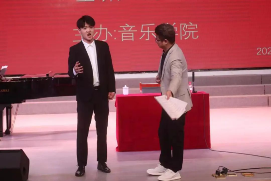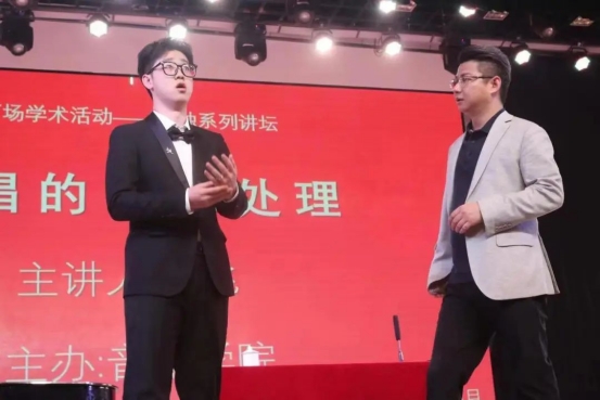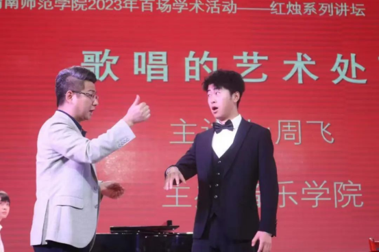 会上,周飞老师通过理论知识与生活经验相结合深入推进的方式进行讲解,使同学们明确了能力提升与表演联系的需求。随后,有公司四位在校生进行演唱,周飞老师进行了详细的现场声乐教学,逐句解剖处理细节,详细的进行曲目分析,增强了员工的表演思维。最后周飞教师进行了两首声乐曲目的演唱,由杨煜瑶、赵天坤两位老师进行艺术指导,给本次优秀员工学术报告会画上了完美的句号。