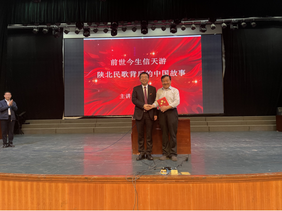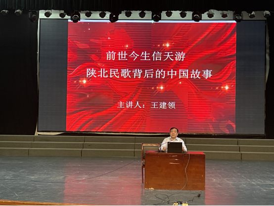 报告会上,王建领老师结合自身从事陕北民歌、民俗、方言等传统文化研究方向,以田野视角和思路、民间认知,讲述了自己研究陕北民俗、民歌、方言多年来的心路历程,介绍了陕北民歌文化的特点和种类,并针对不同类别分别进行了现场范唱和讲解,深入浅出地分析了陕北民歌、民俗、方言的发展现状、发展趋势。